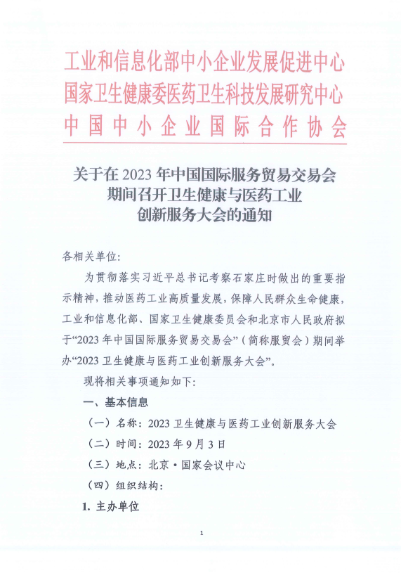 關(guān)于在2023年中國(guó)國(guó)際服務(wù)貿(mào)易交易會(huì)期間召開衛(wèi)生健康與醫(yī)藥工業(yè)創(chuàng)新服務(wù)大會(huì)的通知